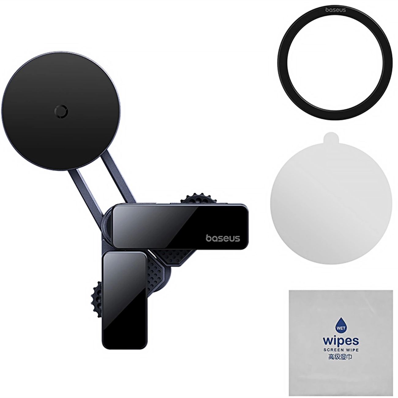 | اقلام داخل جعبه | پایه نگهدارنده مغناطیسی بیسوس، حلقه مغناطیسی فلزی، صفحه مغناطیسی گرد، دستمال تمیزکننده |