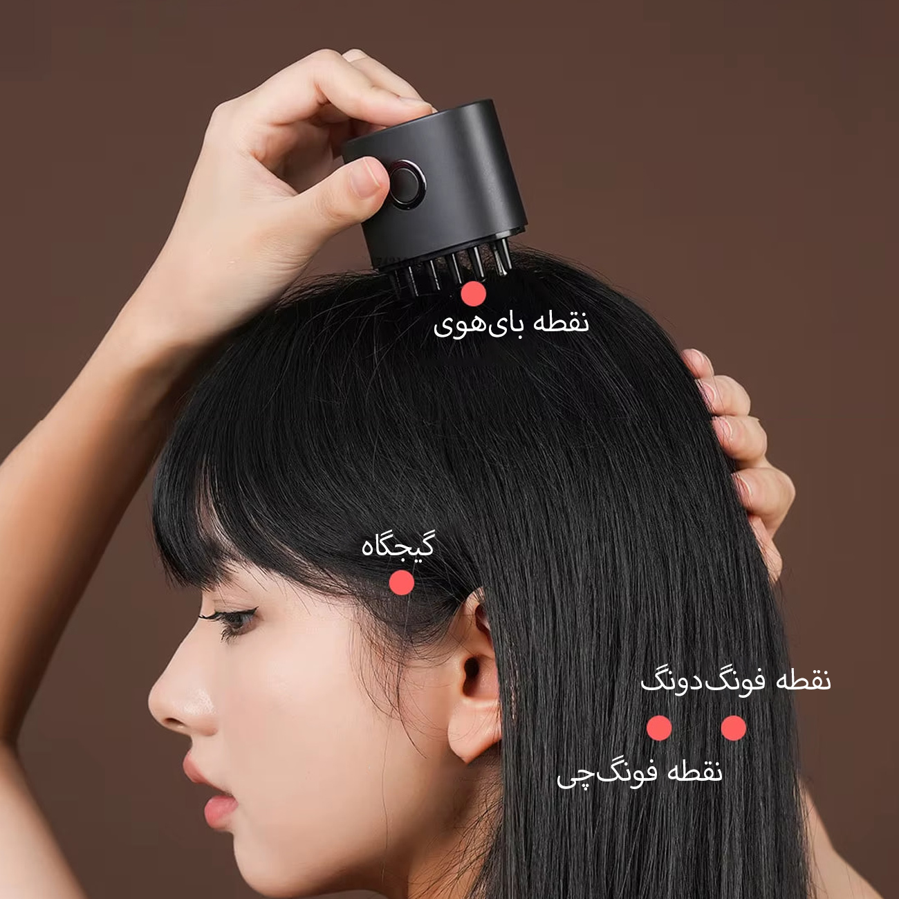 | قابلیت ها | ماساژ پوست سر، توزیع یکنواخت سرم و محلول، نور درمانی قرمز و آبی |