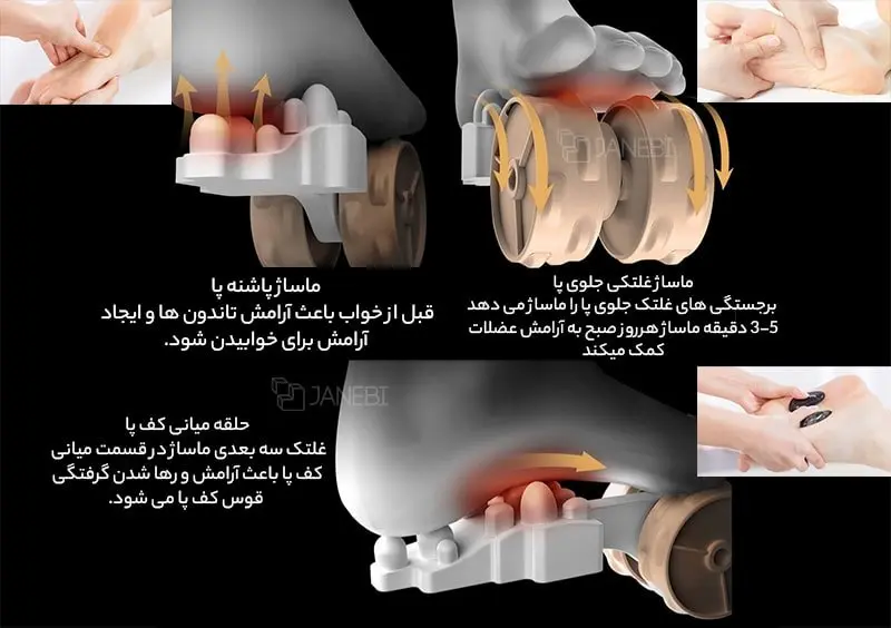 قسمت زیرین این دستگاه دارای المان های مادون قرمز می باشد و گرما از طریق همین المان ها به پا منتقل می گردد. گرمای ایجاد شده دمای پا ها و در نهایت جریان خون را بالا می برد و باعث احساس راحتی و آرامش کاربر می گردد. بنابراین این دستگاه نه تنها یک ماساژور برقی است بلکه که به عنوان کمپرس گرم نیز عمل می کند.