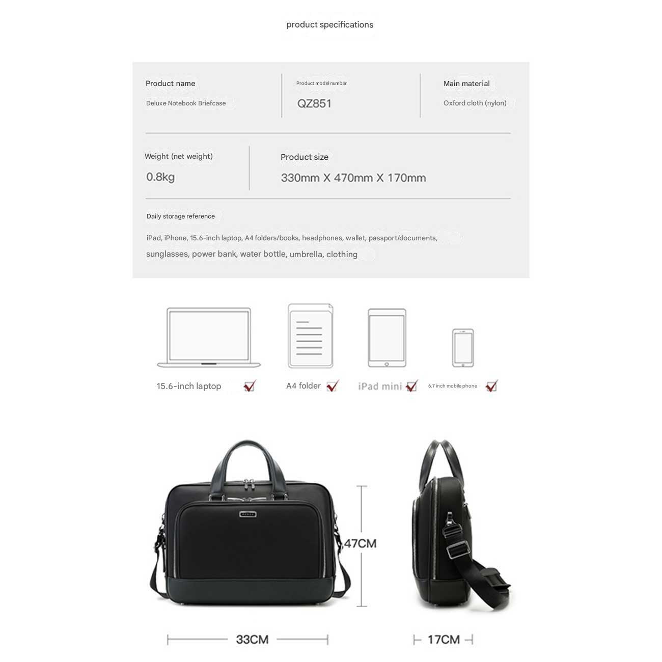 | ظرفیت | لپتاپ 15.6 اینچی، آیپد مینی، موبایل 6.7 اینچی، مدارک A4، کیف پول، دفترچه، عینک، شارژر، چتر، بطری آب، لباس |
