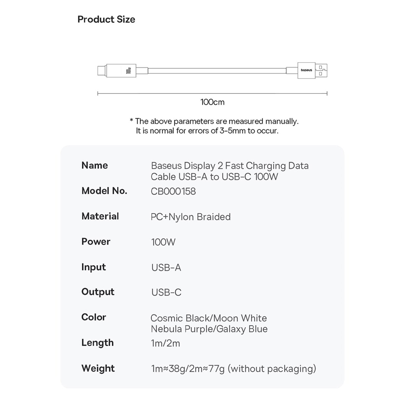 Baseus P10382701121-00 USB to Type-c Cable Display 2 100w Fast Charging Cable