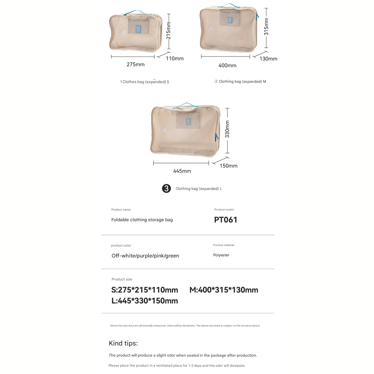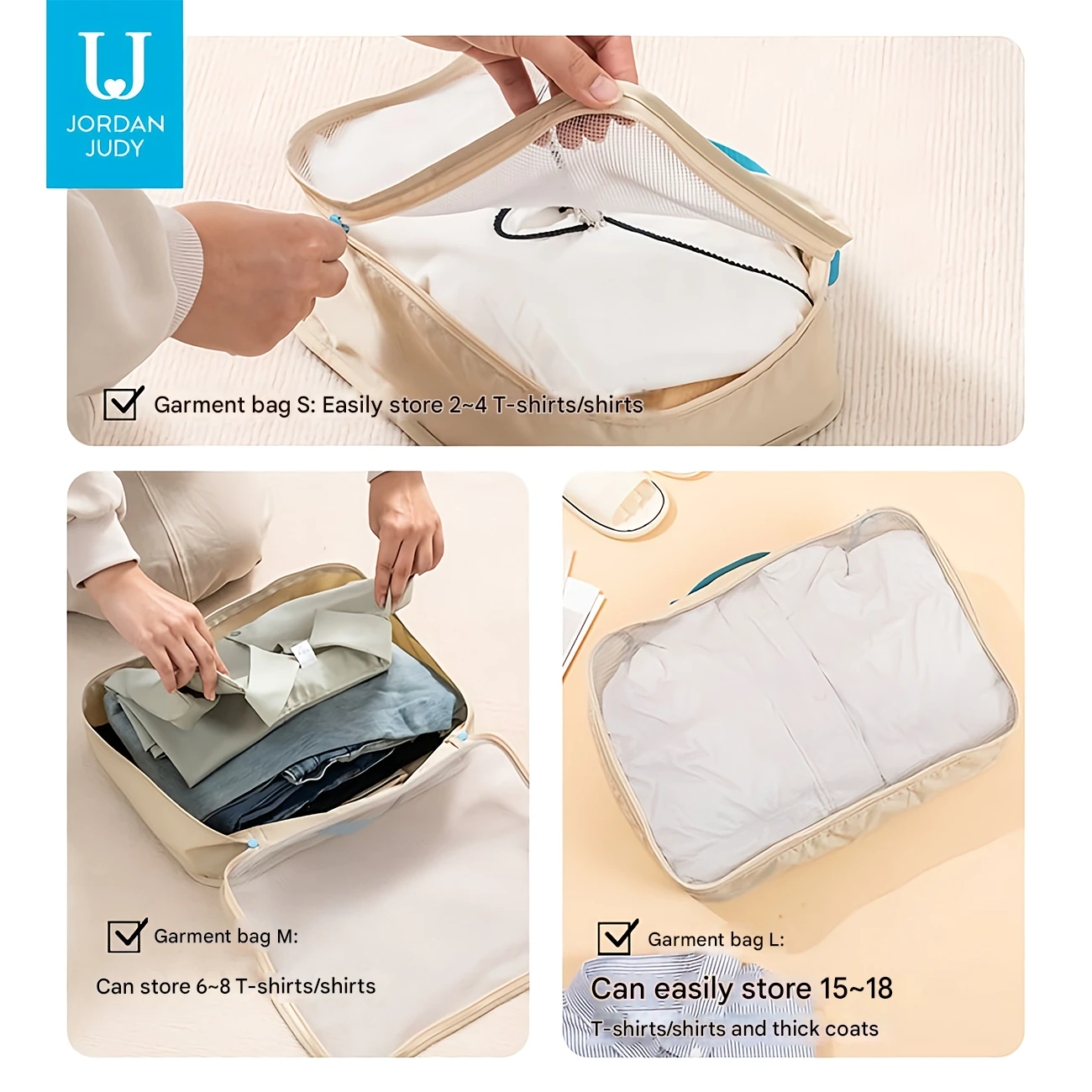 | ظرفیت تقریبی | سایز S: مناسب 2 تا 4 تیشرت، سایز M: مناسب 6 تا 8 لباس متوسط، سایز L: مناسب 15 تا 18 لباس یا کاپشن و لباس ضخیم |