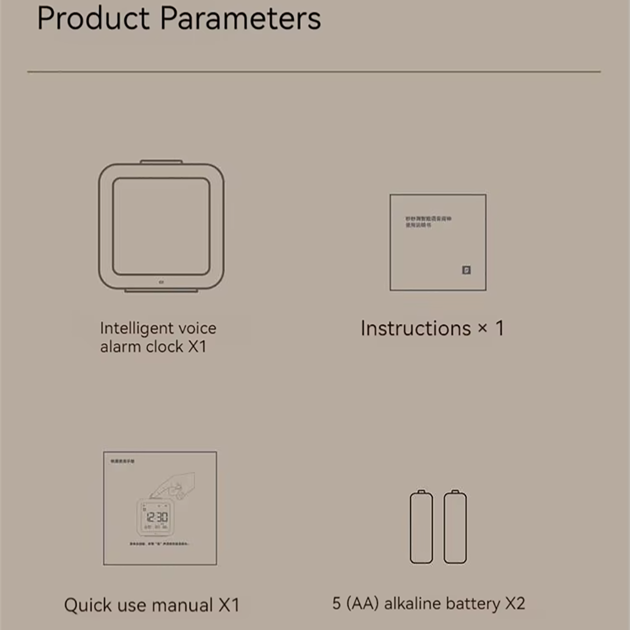 | محتویات بسته | ساعت زنگدار هوشمند، دستورالعملها، راهنمای کاربر، باتری آلکالاین AA |