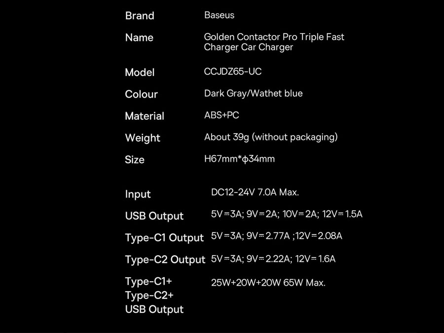 Baseus Golden Contactor Pro USB-A car charger + 2x USB-C 65W CGJP010003