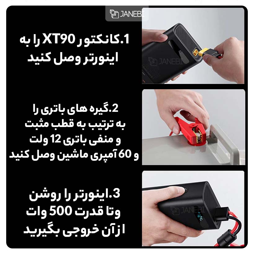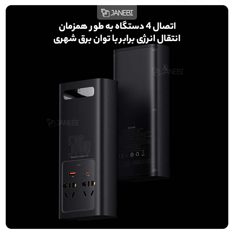 | سایر مشخصات | شدت جریان ورودی DC گیرههای کروکودیلی : 12 وات 60 آمپر شدت جریان ورودی شارژر فندکی DC : 12 ولت 20 آمپر شدت جریان خروجی USB-A : 5 ولت / 3 آمپر، 9 ولت / 2 آمپر، 10 ولت / 2 آمپر، 12 ولت / 2.5 آمپر شدت جریان خروجی USB-C : 5 ولت / 3 آمپر، 9 ولت / 2.77 آمپر، 12 ولت / حداکثر 2.5 آمپر شدت جریان خروجیهای AC توسط سیم های کروکودیلی : حداکثر 200-240 ولت 50 هرتز 500 وات شدت جریان خروجیهای AC توسط شارژر فندکی : 200-240 ولت 50 هرتز 150 وات |