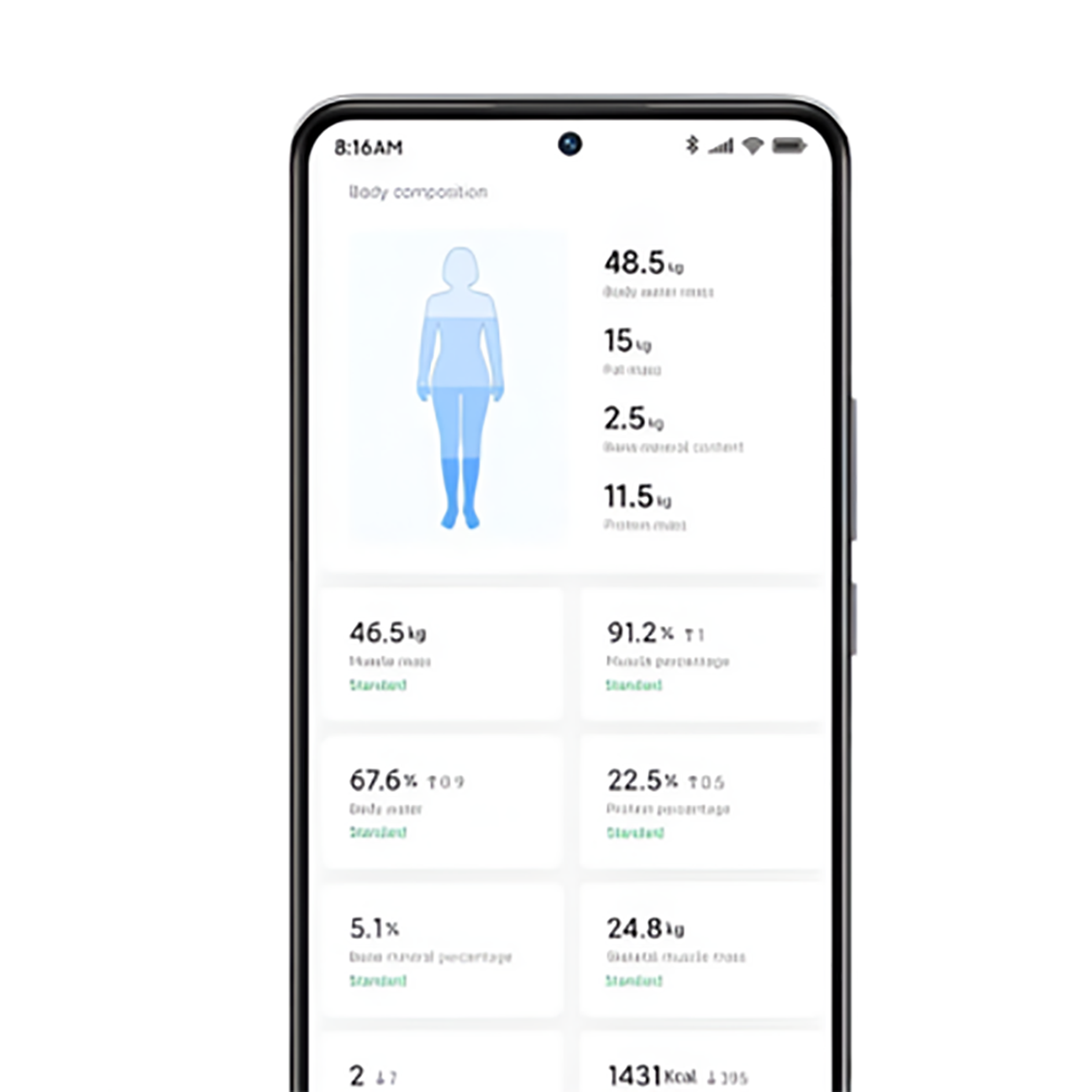 | شاخص های اندازه گیری | وزن، ضربان قلب، BMI، درصد چربی بدن، توده عضلانی، محتوای پروتئین، توده استخوان، چربی احشایی و موارد دیگر |