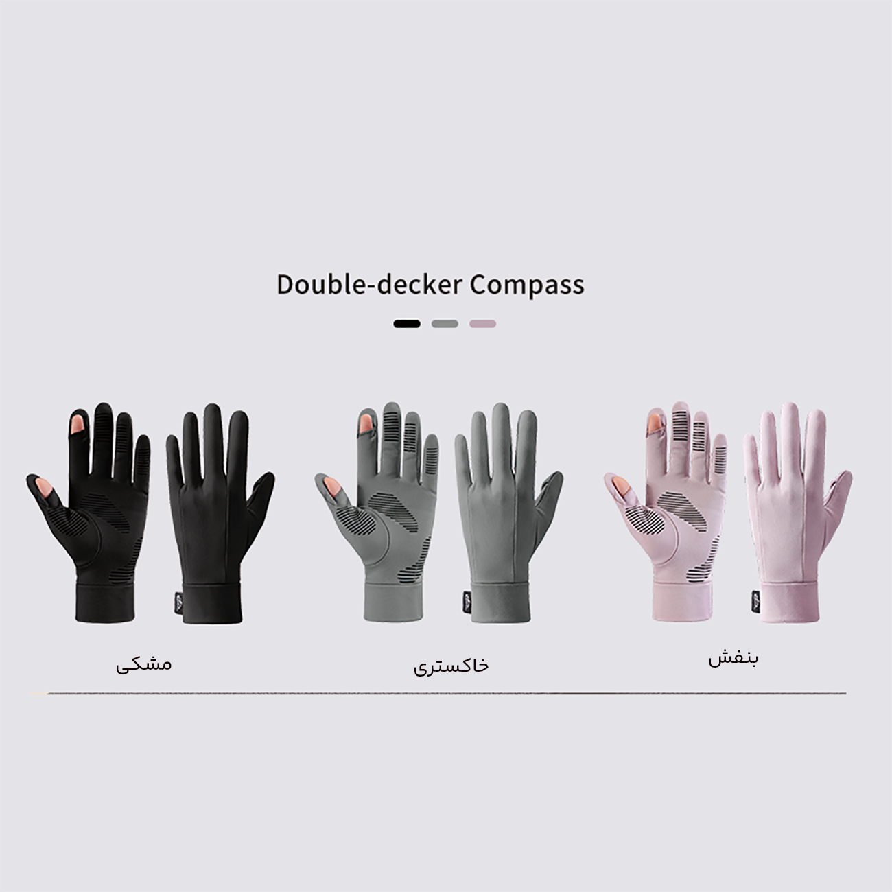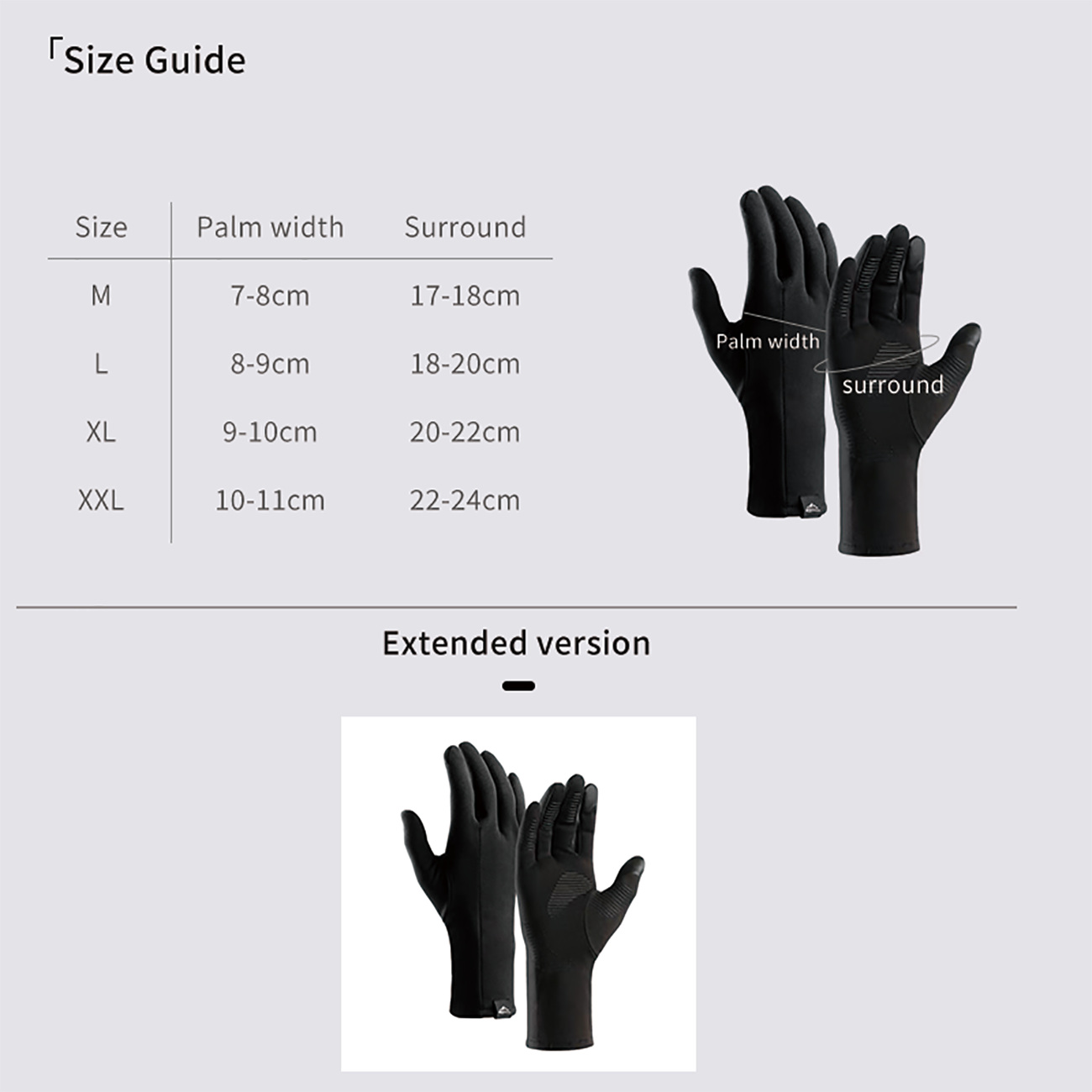 | اندزه | سایز M : عرض کف دست: 7-8 سانتی متر، محیط: 17-18 سانتی متر سایز L : عرض کف دست: 9-8 سانتی متر، محیط: 20-18 سانتی متر سایز XL : عرض کف دست: 9-10 سانتی متر، محیط: 20-22 سانتی متر سایز XXL: عرض کف دست: 11-10 سانتی متر، محیط: 24-22 سانتی متر |