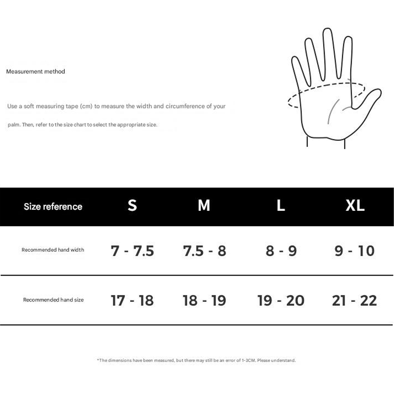 | اندازه دست | S: 7-7.5 سانتیمتر عرض، 17-18 سانتیمتر محیط، M: 7.5-8 عرض، 18-19 محیط، L: 8-9 عرض، 19-20 محیط، XL: 9-10 عرض، 21-22 محیط |